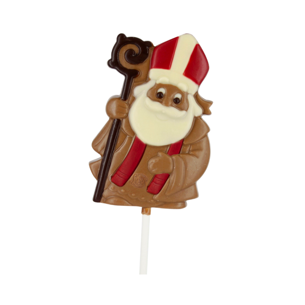Lollipop Mos Nicolae - figurină din ciocolată belgiană cu lapte, în patru culori, care poate fi dăruită cadou celor mici și celor mari sau numai bună de pus în ghetuțe în seara de Moș Nicolae.