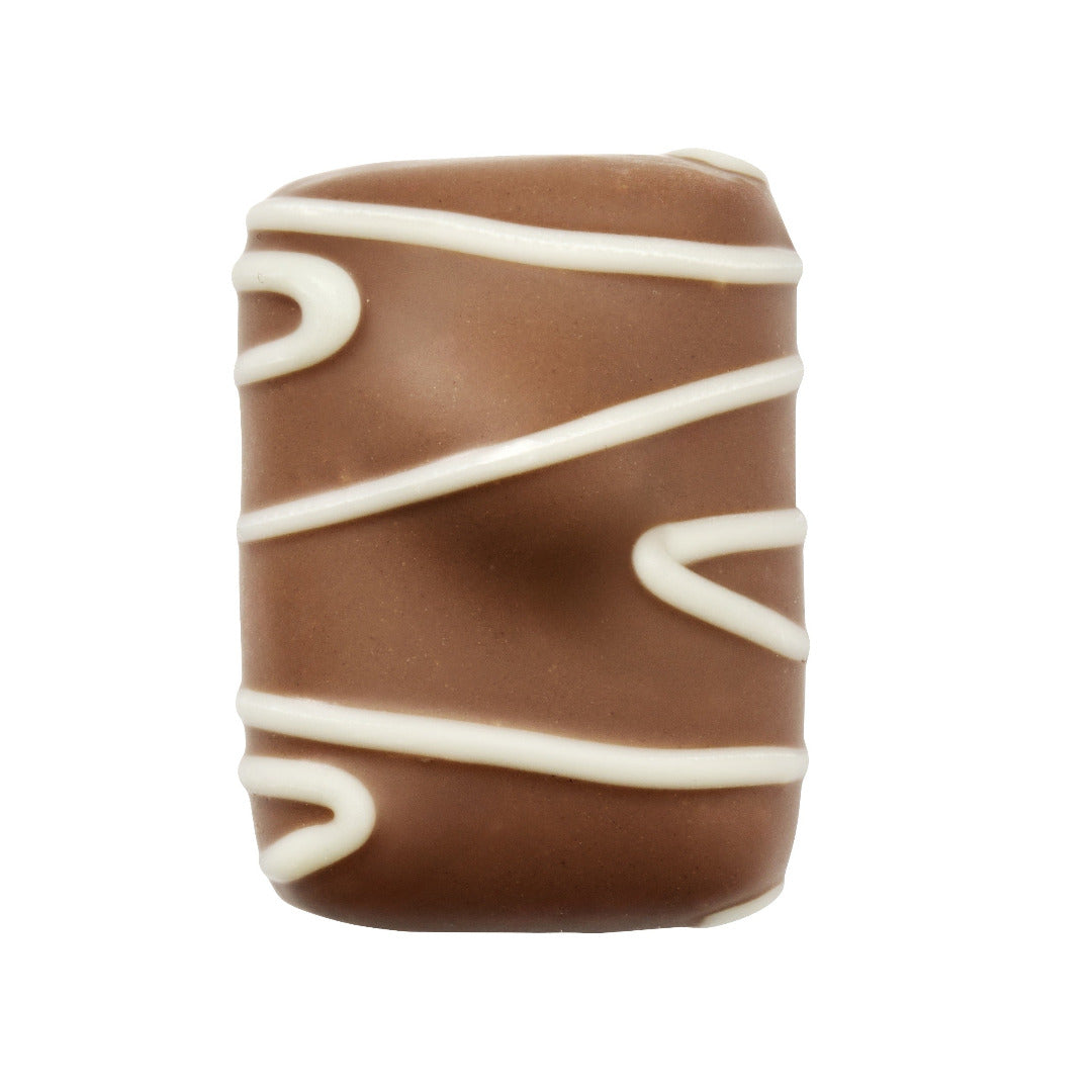 O pralină senzuală cu cremă de unt cu alune de pădure, cremă pralinată și o perlă crocantă de nugatină, învelită în ciocolată cu lapte cu dungi de ciocolată albă